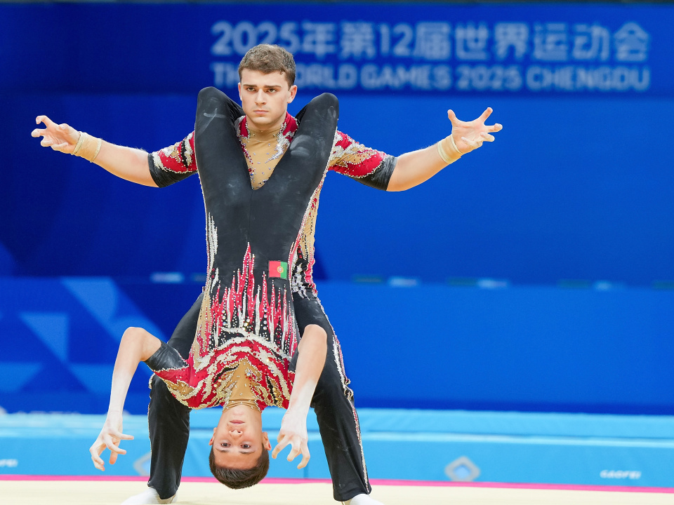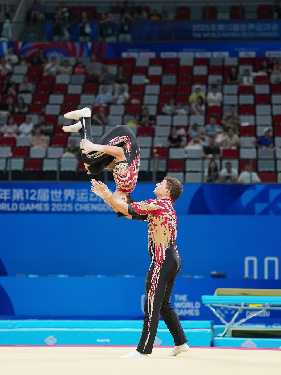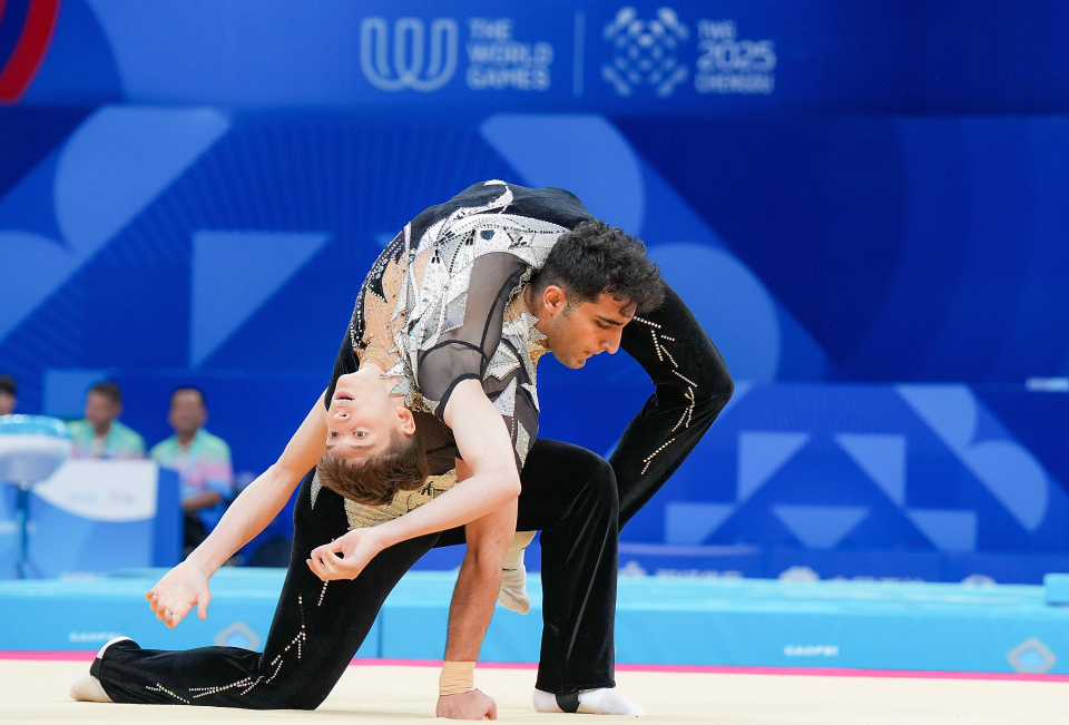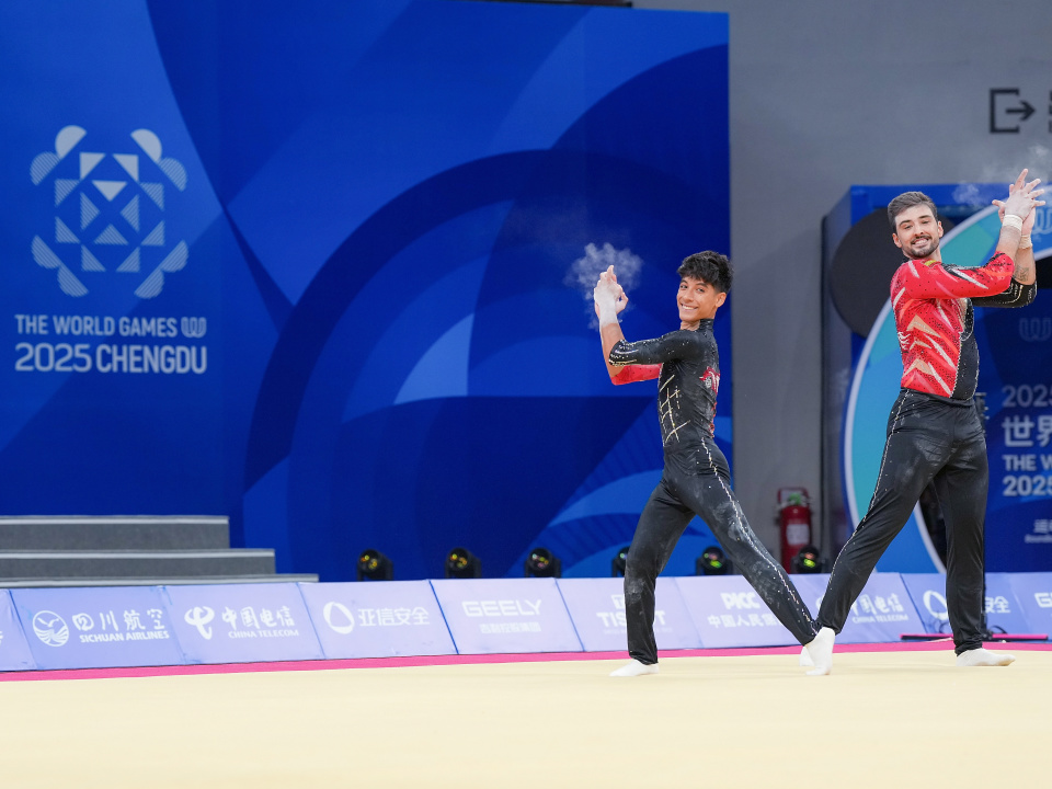 当日,2025年成都世运会技巧男子双人决赛举行。